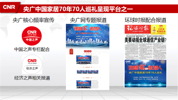 本次活动历时三个月,将以中央重点新闻网站——央广网家居频道为宣传主阵地,通过记者走进各大家居企业实地采访等方式,运用包含广播、互联网和移动客户端等在内的央广融媒体资源以及《环球时报》、全国高铁、机场等户外媒体对巡礼活动进行广泛传播。